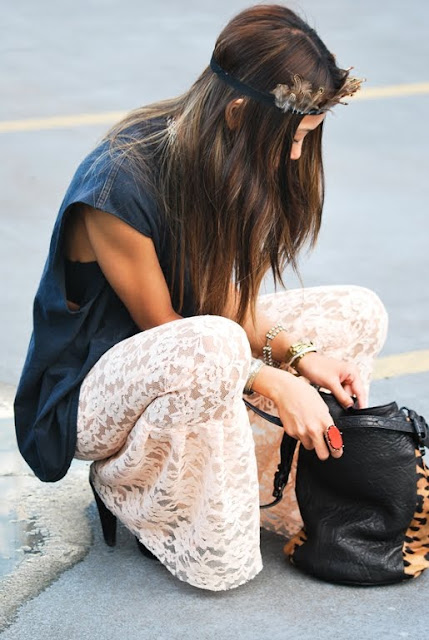 I always loved lace and I admired to the softness and all the details of it. It's an unique material. But I never had an idea of lace pants. Since I saw these photos and few more of them, I realized that a piece like that can be a brave, but good choice.